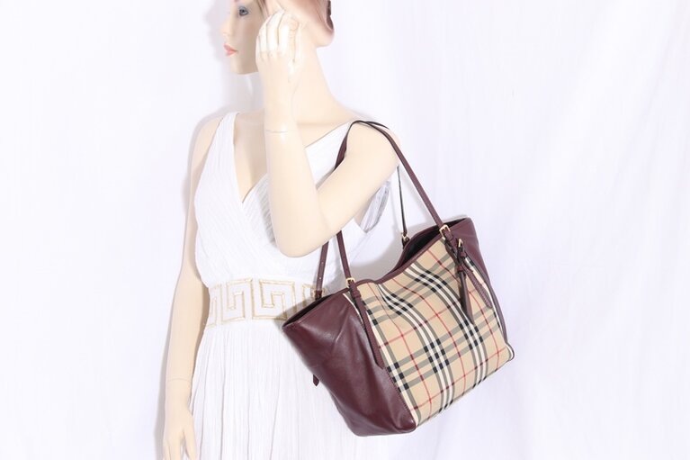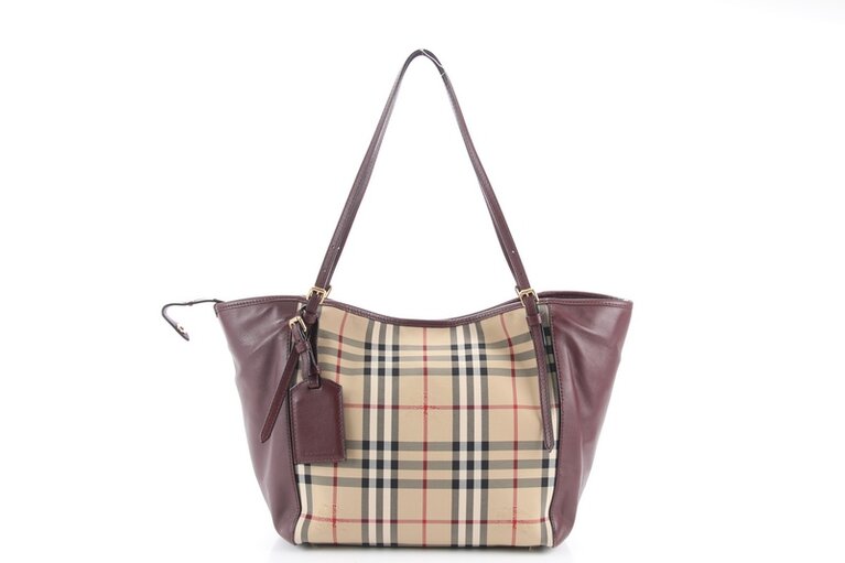 Burberry Canter Schultertasche Beige Check Textil Bordeaux Leder