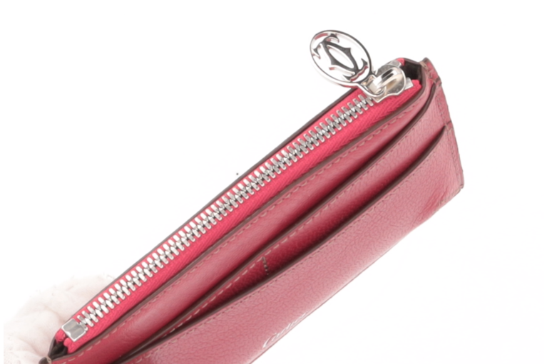 Eleganter Cartier Kartenhalter aus hochwertigem bordeauxrotem Leder, der Funktionalität und stilvolles Design vereint. Der integrierte Schlüsselring macht ihn zum praktischen Begleiter für Karten und Schlüssel im Alltag.