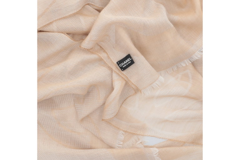 Dieses CHanel Tuch präsentiert sich in einem zeitlosen, eleganten Beige, durchwoben mit dem ikonischen Doppel-C-Logo (Coco Mark) in einem helleren Cremeton. Die feine Webstruktur und die ausgefransten Kanten verleihen dem Schal eine klassische, legere Note.