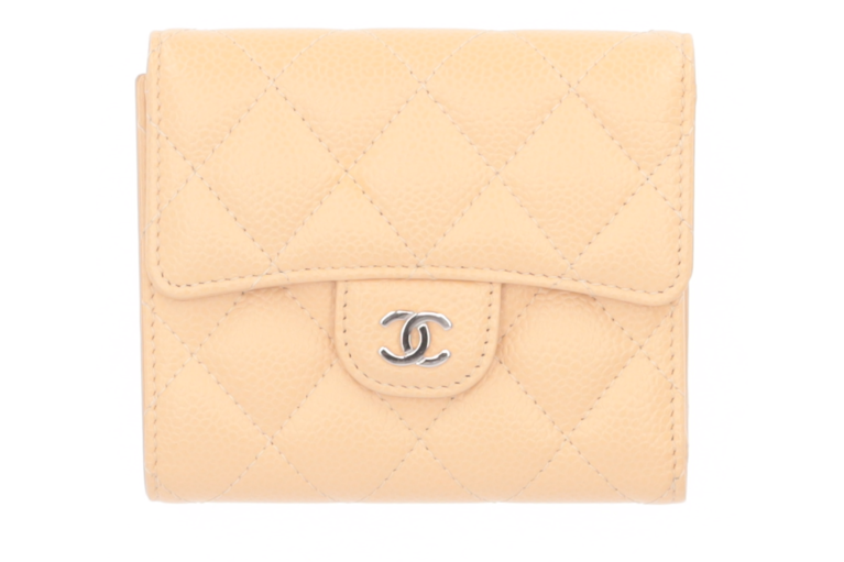 Dieses elegante Chanel Classic Kompakt-Portemonnaie im Trifold-Design verkörpert die ikonische Handschrift von Chanel. Gefertigt aus strapazierfähigem beigem Caviar-Leder mit edler Matelassé-Steppung, verbindet es luxuriöse Optik mit Alltagstauglichkeit. Das durchdachte Innenleben bietet Platz für Karten, Scheine und Münzen, während das kompakte Format perfekt in jede Tasche passt – ein zeitloses Accessoire für Liebhaberinnen klassischer Eleganz.