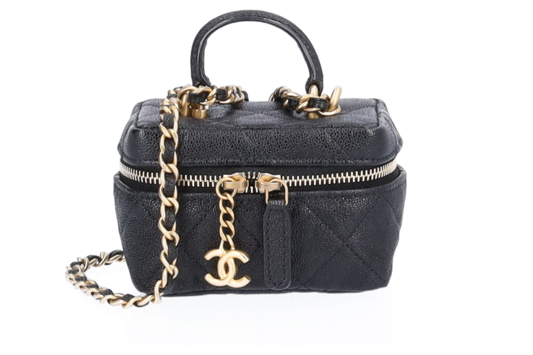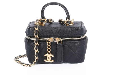 Chanel Two Way Mini Vanity Tasche Schwarz Kaviar Leder mit goldenen Beschlägen