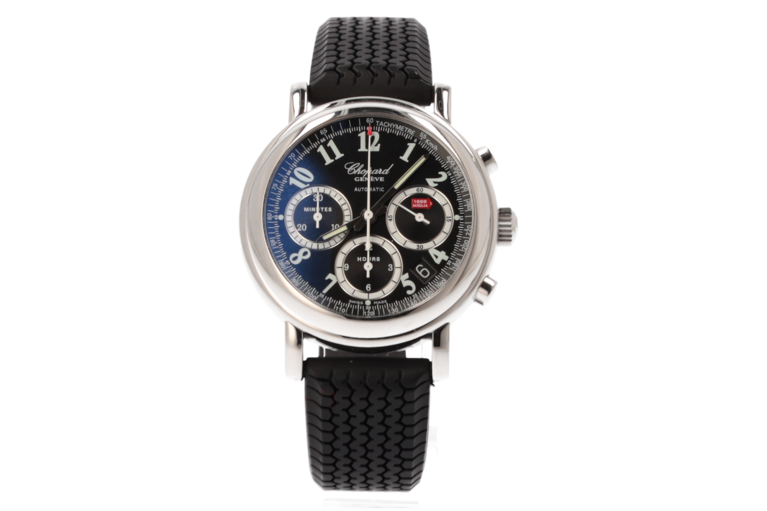 Dieser fantastische Chopard Chronograph mit schwarzem Zifferblatt kommt mit einem von Gummireifenprofilen inspirierten Kautschuk Armband und einer Edelstahlschliesse.