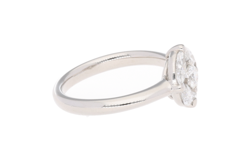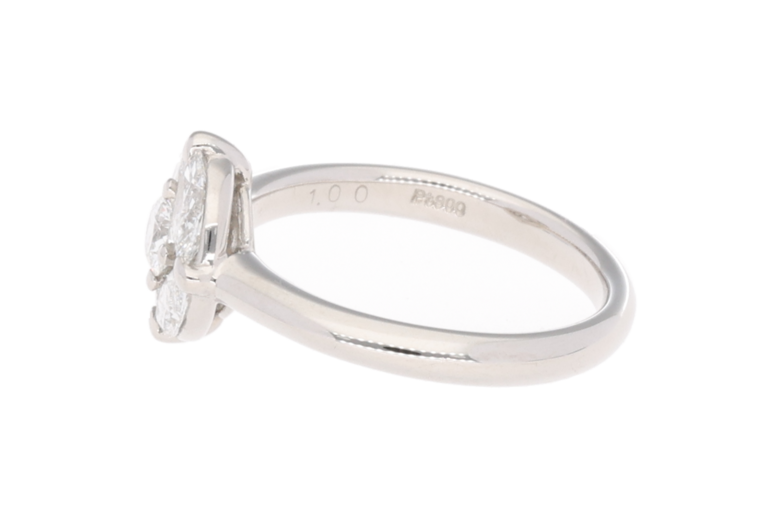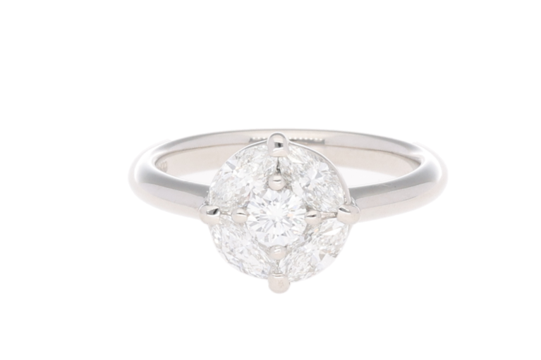 Dieser aussergewöhnliche Diamant Ring vereint klassische Eleganz mit raffinierter Formgebung. Im Zentrum steht ein funkelnder Brillant mit 1.00 ct, der von vier seitlich angeordneten Marquise Schliff Diamanten harmonisch flankiert wird. Das Zusammenspiel der unterschiedlichen Schliffe erzeugt ein lebendiges Lichtspiel und verleiht dem Ring eine besonders edle Ausstrahlung. Die 900er Platin Ringschiene unterstreicht die Wertigkeit des Designs und sorgt für Stabilität sowie langanhaltenden Glanz. Platin ist äusserst robust und betont die Brillanz der Diamanten durch seinen kühlen, eleganten Farbton. In Ringgrösse 52 gefertigt, ist dieses Schmuckstück eine stilvolle Wahl als Verlobungsring oder als exklusiver Begleiter mit bleibendem Wert.