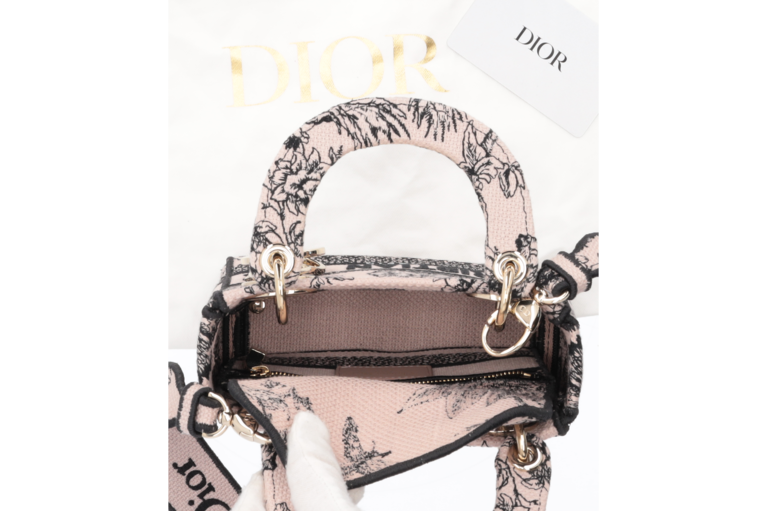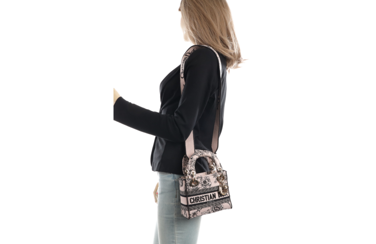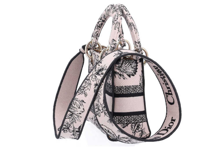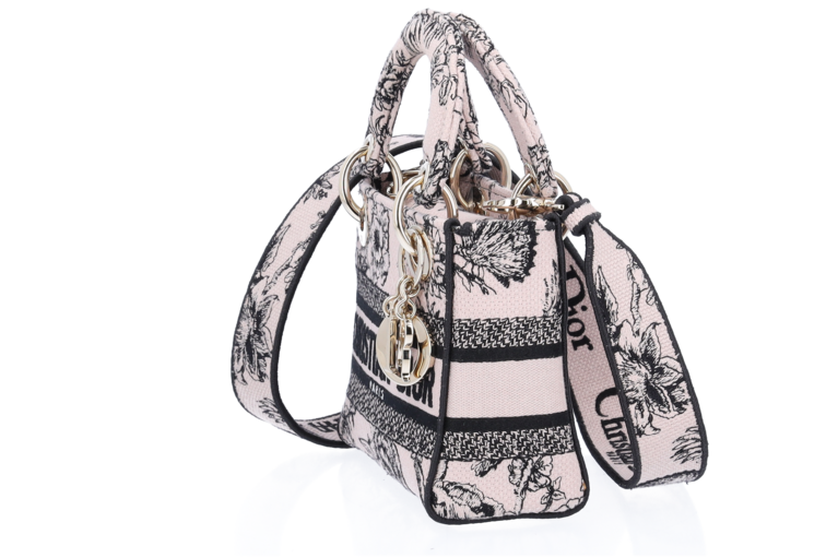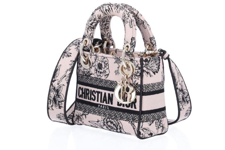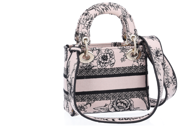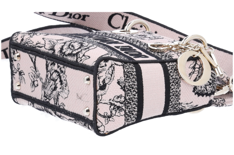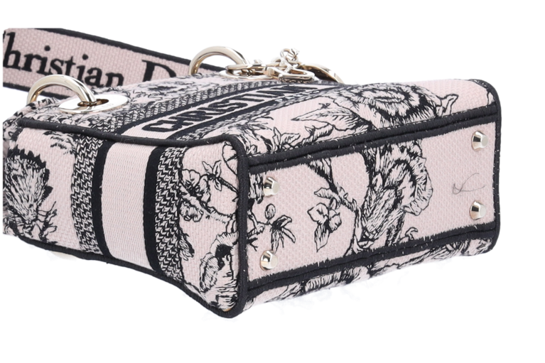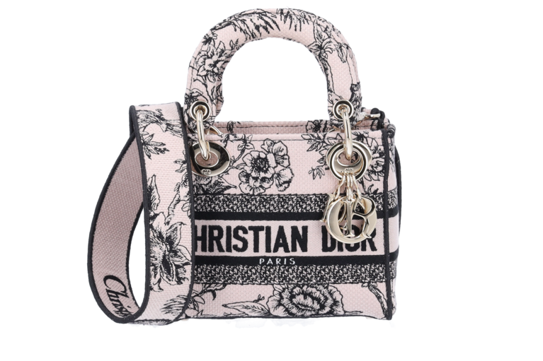 Diese Mini Bag aus dem Hause Dior ist eine moderne Interpretation der ikonischen Lady Dior Linie. Gefertigt aus hochwertigem Textil, zeigt sie ein ausdrucksstarkes Blumenmotiv in Schwarz auf rosafarbenem Grund und kombiniert romantische Elemente mit grafischer Klarheit. Der charakteristische Dior Schriftzug auf der Vorderseite unterstreicht den unverkennbaren Markenstil. Dank der kompakten Form eignet sich die Tasche ideal für die wichtigsten Essentials und ist ein stilvoller Begleiter für Tag und Abend. Der feste Tragegriff sowie der abnehmbare Schulterriemen ermöglichen verschiedene Tragevarianten – von elegant in der Hand bis lässig crossbody. Die sorgfältige Verarbeitung und das harmonische Farbspiel machen diese Tasche zu einem begehrten Sammlerstück für Dior Liebhaberinnen, die Design, Qualität und einen besonderen Look schätzen.