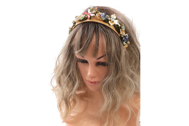Opulenter Dolce & Gabbana Haarreif mit aufwendig gearbeiteten Schmuck- und Kristallapplikationen. Goldfarbene Zierelemente, facettierte Steine in Rot-, Grün- und Blautönen sowie textile Details verleihen dem Accessoire einen luxuriösen, barocken Charakter. Ein ausdrucksstarkes Statement-Piece für besondere Anlässe.