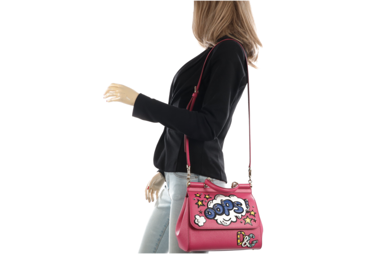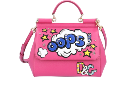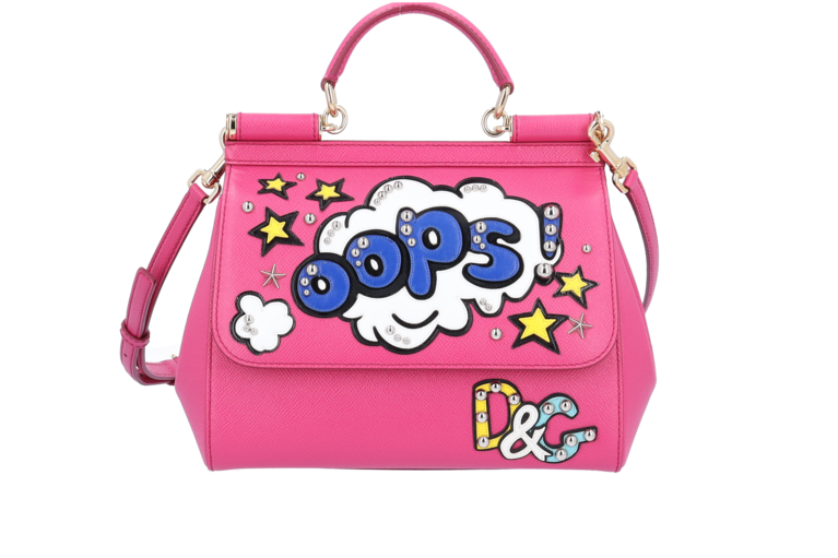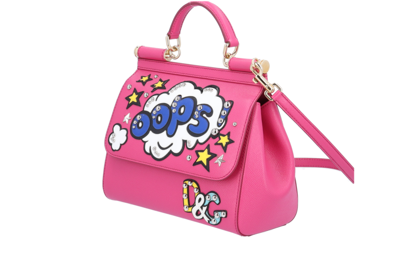 Die Dolce & Gabbana Sicily Medium „Oops!“ Tasche ist ein echtes Statement-Piece im Pop-Art-Stil. Das leuchtende Pink kombiniert mit auffälligen Applikationen, Comic-Schriftzügen und funkelnden Sternen sorgt für einen verspielten, modernen Look mit Glam-Faktor. Gefertigt aus hochwertigem Leder und mit goldfarbenen Details versehen, verbindet diese Tasche kunstvolles Design mit italienischer Handwerkskunst. Ob in der Hand oder mit dem Schulterriemen getragen – sie zieht garantiert alle Blicke auf sich und bringt Farbe, Humor und Stil in jeden Auftritt.