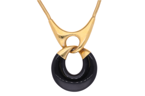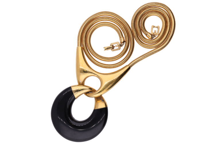 Dieses elegante Givenchy Collier kombiniert eine moderne, goldfarbene Optik mit hochwertigen Acetat-Elementen. Die lange Kettenführung von 75 cm verleiht dem Schmuckstück eine fliessende, stilvolle Silhouette, die sich perfekt über Blusen, Kleider oder Strickteile legen lässt. Die harmonische Verbindung von Metall und Acetat schafft einen ausdrucksstarken, zugleich vielseitigen Look, der sowohl im Alltag als auch zu besonderen Anlässen überzeugt. Ein raffiniertes Accessoire für alle, die zeitlose Eleganz mit einem Hauch modischer Extravaganz schätzen.