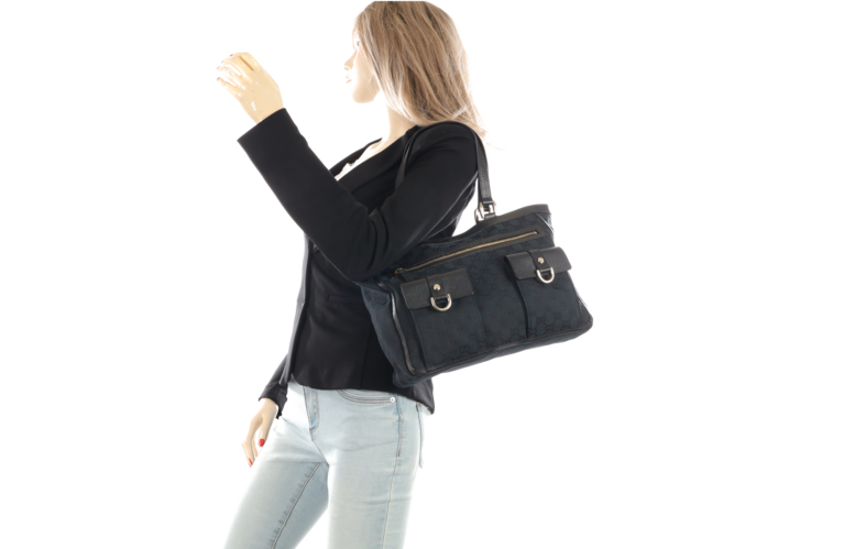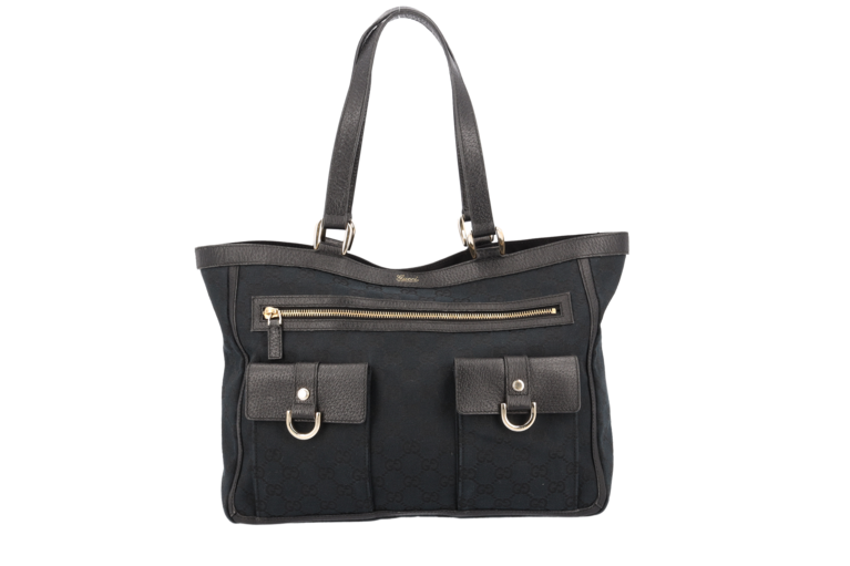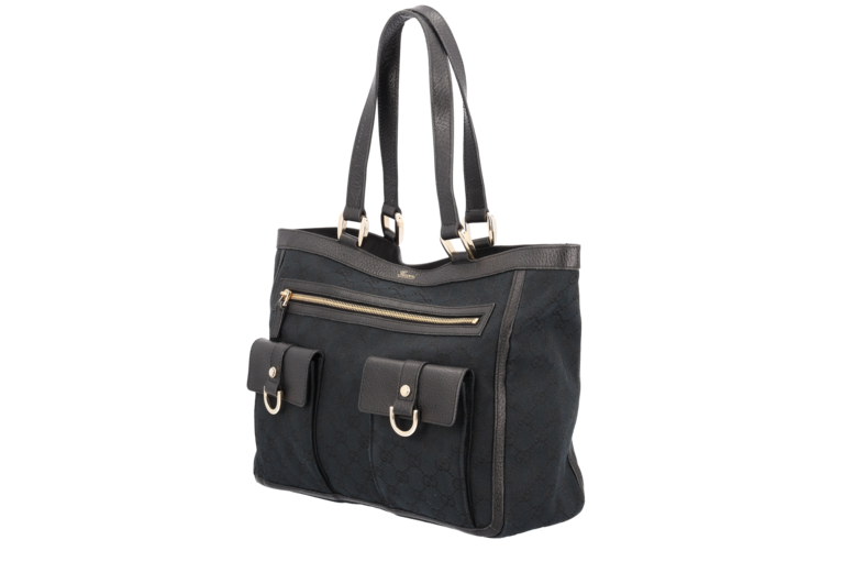 Gucci Abbey Shopper aus navyblauem Canvas mit schwarzen Lederbesätzen und goldfarbenen Beschlägen. Elegante, geräumige Tasche mit Reissverschlussfach und Fronttaschen – ideal für Alltag, Business oder Reisen.