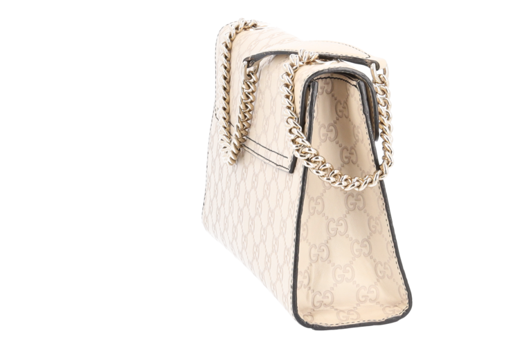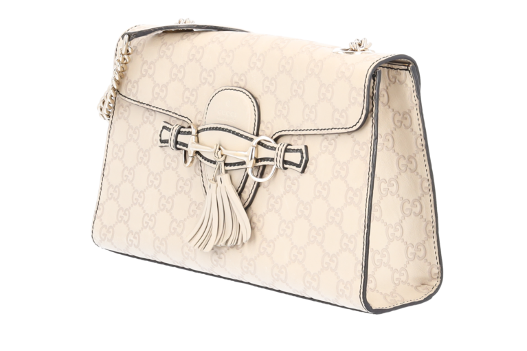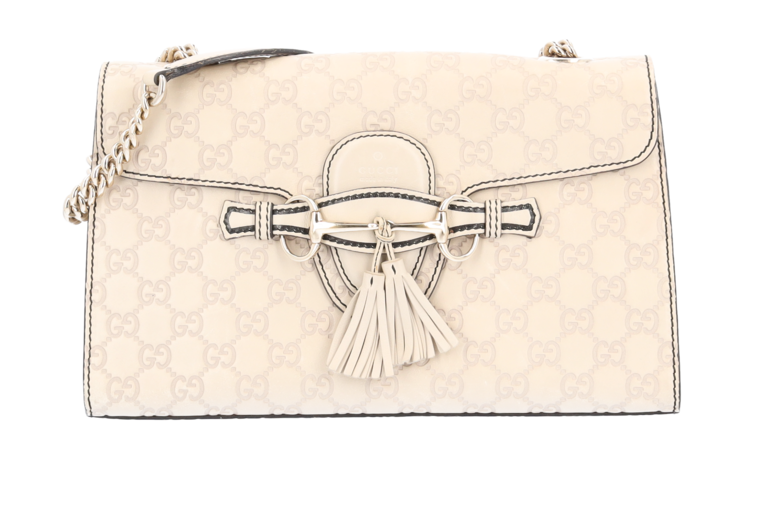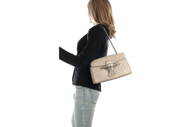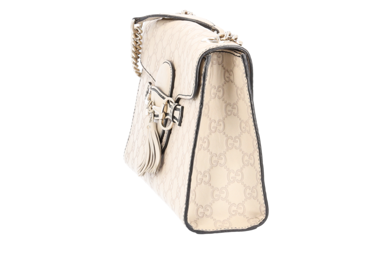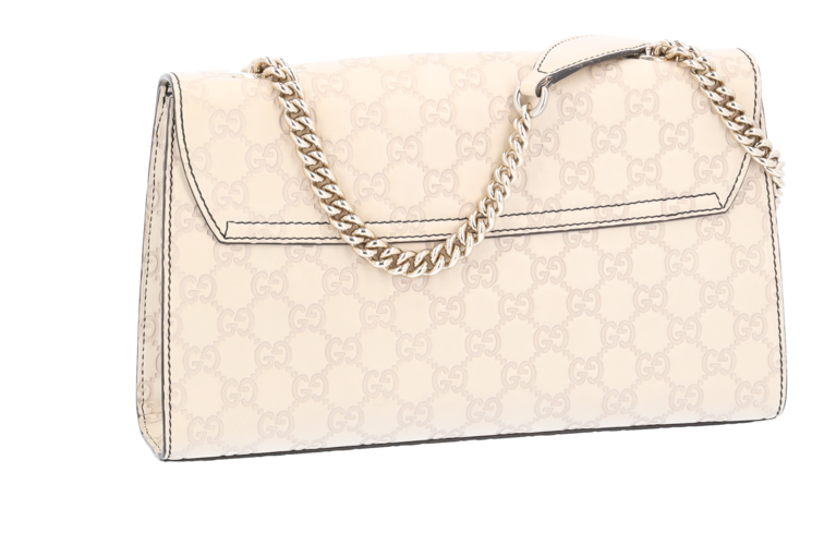 Emily ist ein wunderschönes Lederprodukt aus dem Hause Gucci mit eingestanzten Guccissima Symbolen auf feinstem Leder. Diese elegante Pochette / Umhängetasche lässt sich dank des langen Kettenriemens über der Schulter oder am Ellbogen tragen.