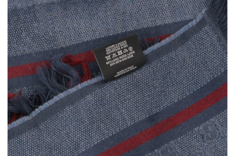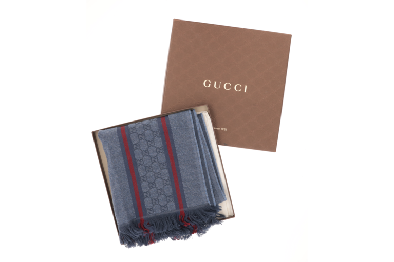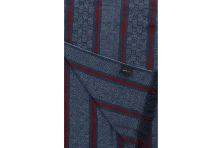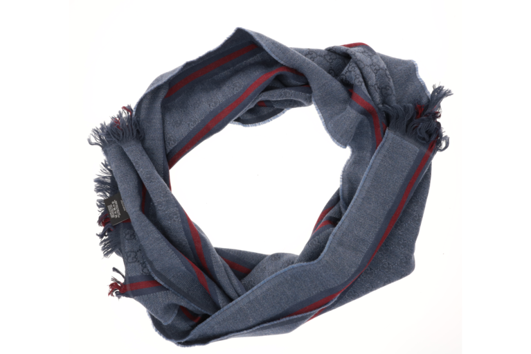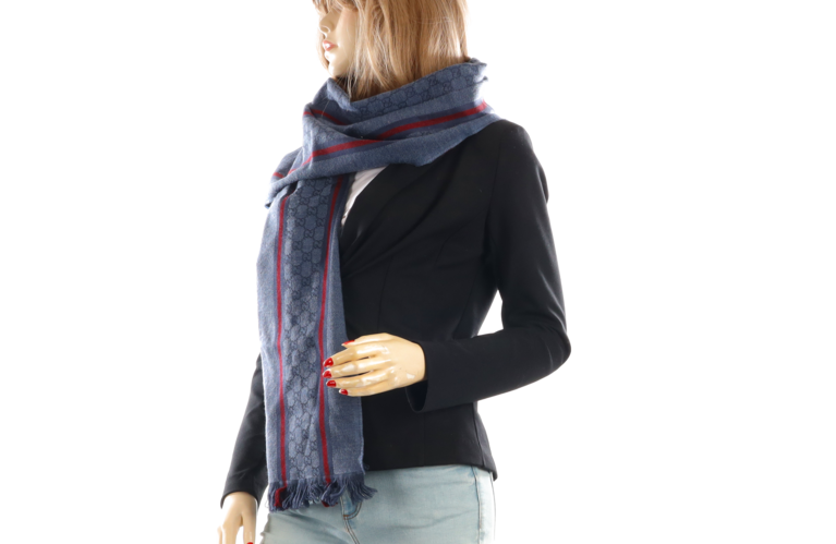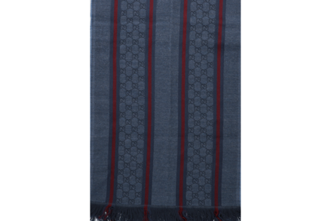 Eleganter Gucci Schal in Blau aus hochwertigem Textil mit ikonischem GG-Monogramm und klassischen rot-blauen Streifen. Die feinen Fransen an den Abschlüssen unterstreichen den zeitlosen, luxuriösen Stil – vielseitig kombinierbar für Damen und Herren.