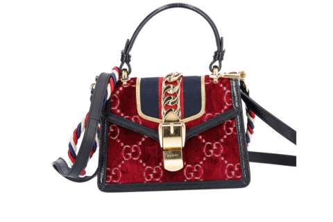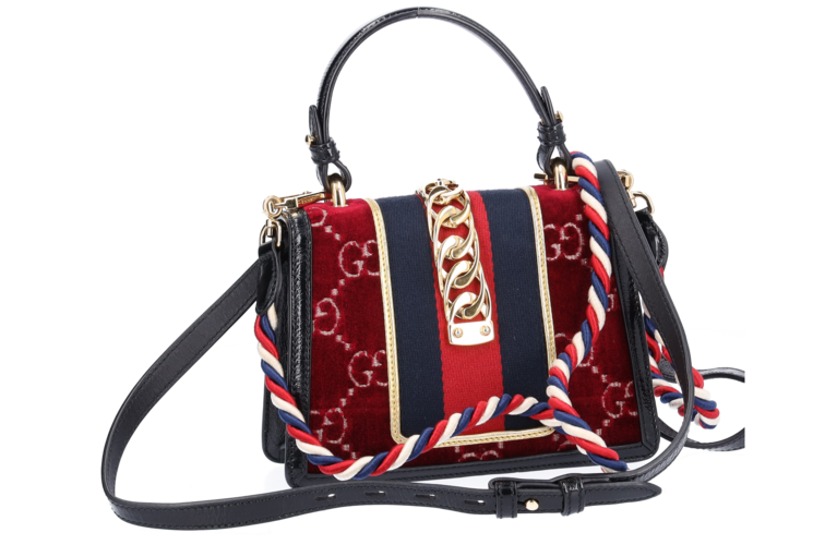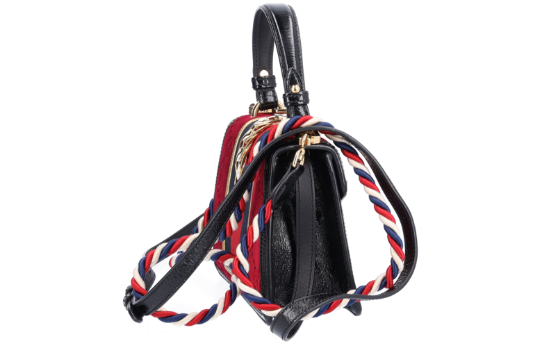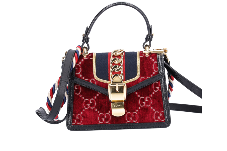 Die Sylvie Tasche als Mini-Henkeltasche mit unter dem Stoff integrierten Webstreifen aus Nylon sowie einer Kette und einer Schnalle in Gold. Der Schnallenverschluss aus Metall stammt aus den Archiven des Hauses und wird auf verspielte Weise mit dem Webstreifen kombiniert. Aus einem festen Glattleder mit zwei verschiedenen Schulterriemen.