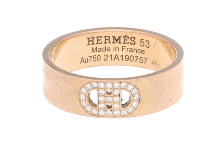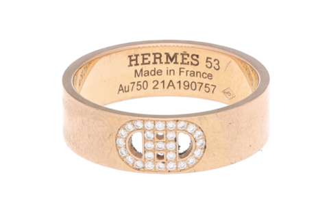 Die Version aus Roségold mit Diamantbesatz verleiht dem maritimen Thema einen luxuriösen Akzent, wobei die feinen Diamanten die Kettenstruktur hervorheben und ein edles Funkeln erzeugen. Dieser Ring ist sowohl als stilvolles Statement als auch als Ausdruck der Hermès-Tradition ein beliebtes Schmuckstück.