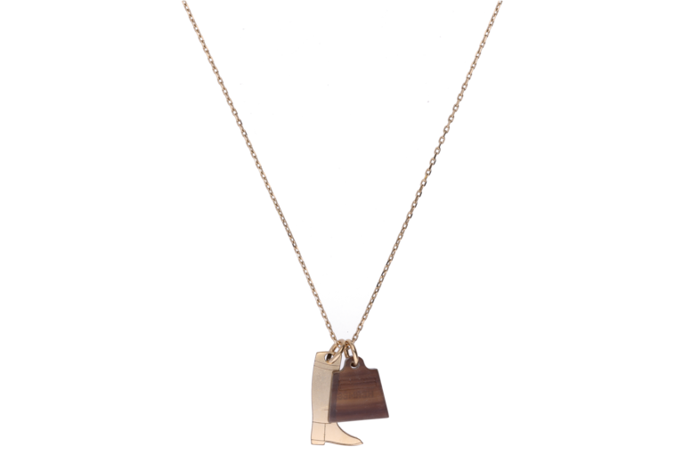 Diese elegante Hermès Kelly Halskette vereint zeitlose Raffinesse mit einem verspielten Twist. Das goldfarbene Design zeigt zwei charakteristische Anhänger – einen stilisierten Stiefel und das ikonische Kelly-Horn-Detail – und erinnert an die feine Handwerkskunst, für die Hermès weltweit bekannt ist. Mit einer Länge von 50 cm lässt sich die Kette sowohl einzeln als auch im Layering mit anderen Schmuckstücken tragen. Ein luxuriöses Accessoire, das jedem Outfit eine subtile, aber unverkennbare Note französischer Eleganz verleiht.