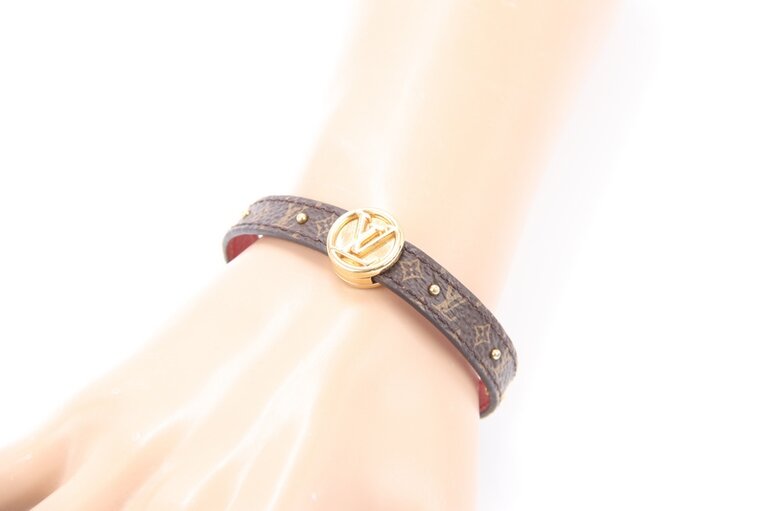 Das wendbare Louis Vuitton LV Circle-Armband aus Monogram-Canvas und glattem Kalbsleder mit Metallnieten und Hakenverschluss ist eine Hommage an das Design-Erbe von Louis Vuitton. Die Inschrift des LV Circle-Logos auf der Vorderseite unterstreicht das klassische Erbe.
