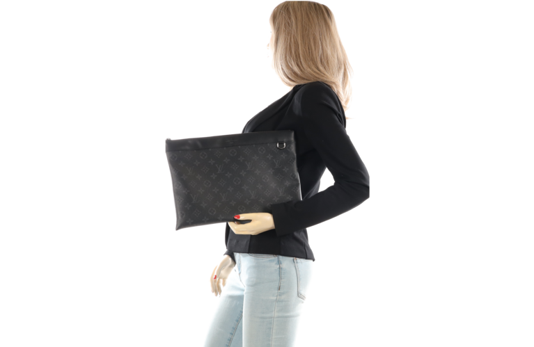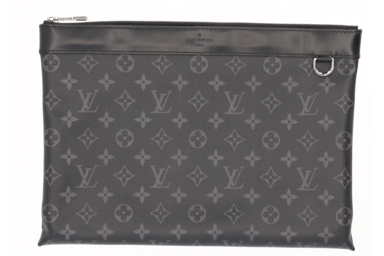 Die aus weichem Monogram Eclipse-Canvas gefertigte Discovery-Tasche hat eine praktische Größe zur Aufbewahrung von Dokumenten und anderen persönlichen Gegenständen. Der Stil ist elegant und modisch und kann in der Hand gehalten oder in eine Tasche gesteckt werden.