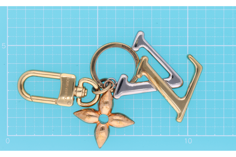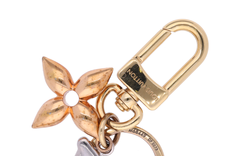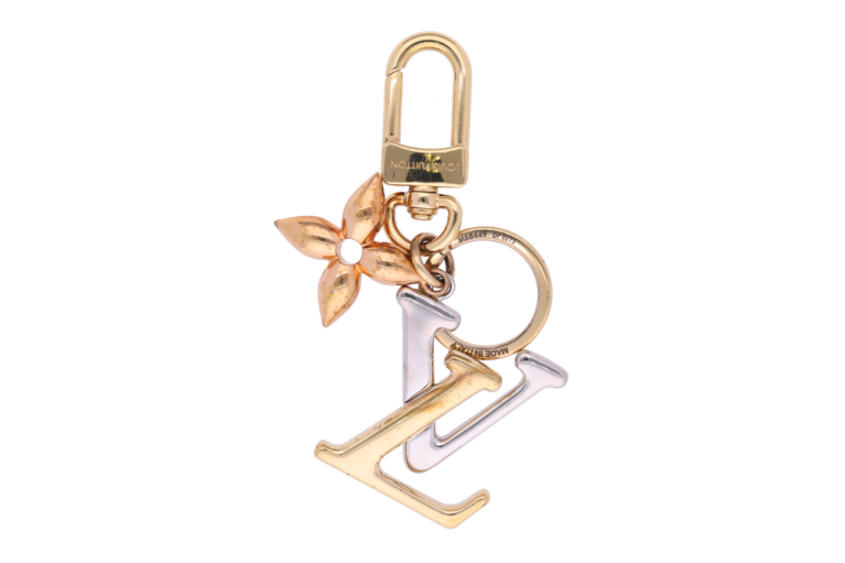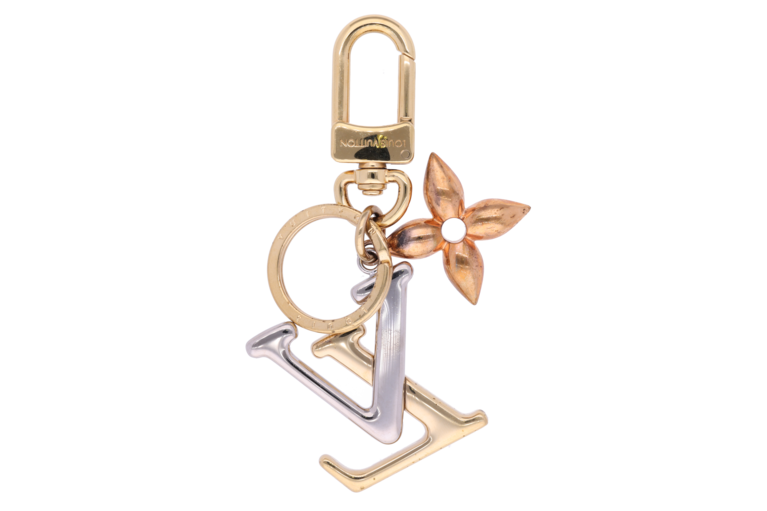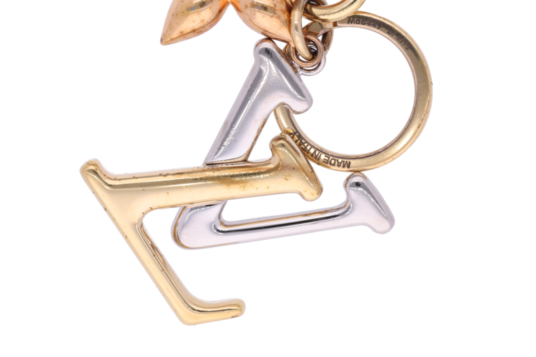 Die LV-Buchstaben, Monogram-Blumen und die Inschrift des Louis Vuitton-Logos interpretieren gemeinsam den klassischen Stil dieser New Wave-Taschendekoration und dieses Schlüsselanhängers und erzählen von der Verschmelzung praktischer Funktionen und wandelbarem Temperament in metallischer Farbe.