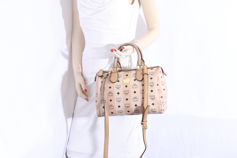 MCM Speedy Bostonbag 30 Streifen Beige Braun Visetos Canvas mit Schulterriemen