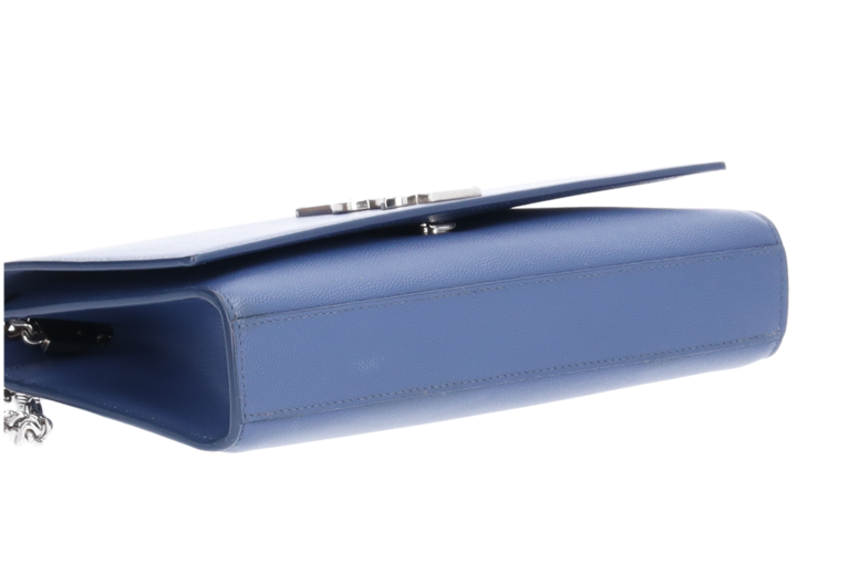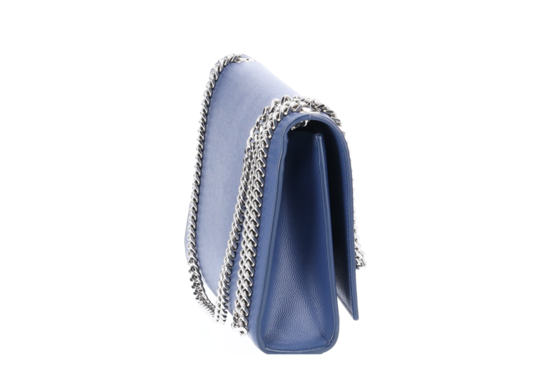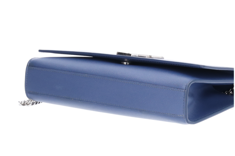 Saint Laurent Kate Medium – blau Schultertasche. Elegantes, glattes Leder mit ikonischem YSL-Logo und goldener Tassel. Kettenriemen, klare Linien – ein zeitloser Klassiker für Abend und Alltag.