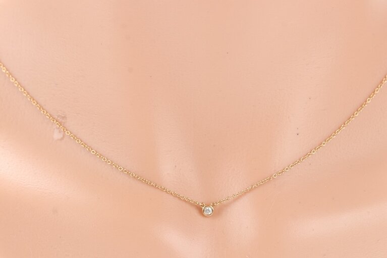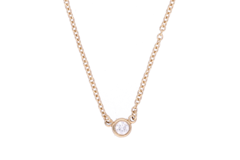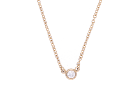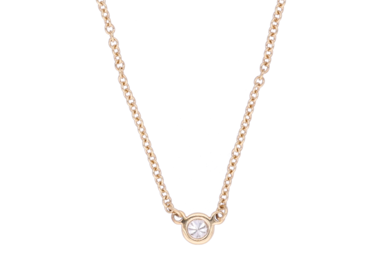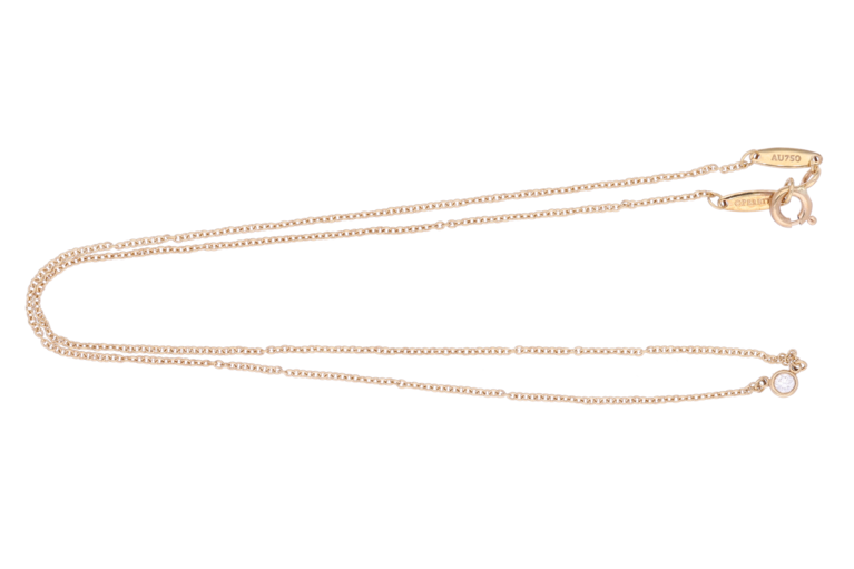 Diese feine Halskette von Tiffany & Co. aus 18 Karat Roségold stammt aus der renommierten Diamonds by the Yard Kollektion von Elsa Peretti. Ein einzelner Diamant mit einem Gewicht von 0.08ct verleiht der Kette eine subtile, elegante Ausstrahlung. Ideal für stilbewusste Träger.