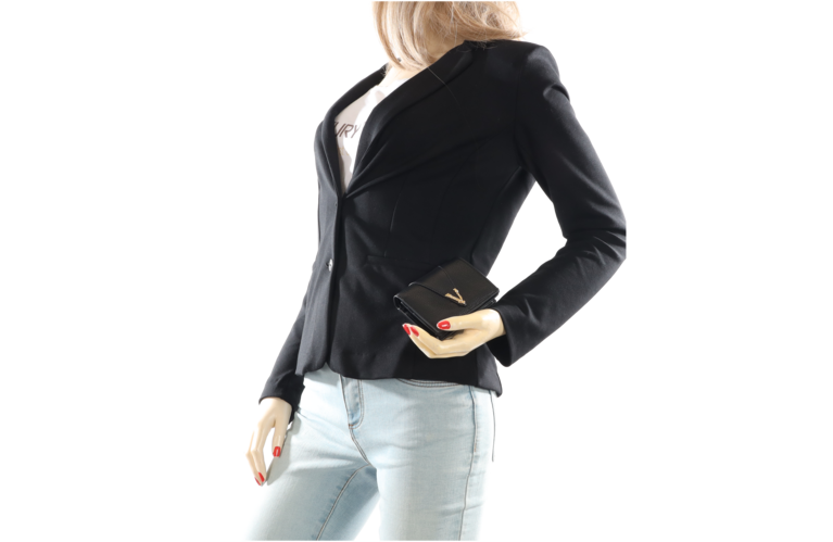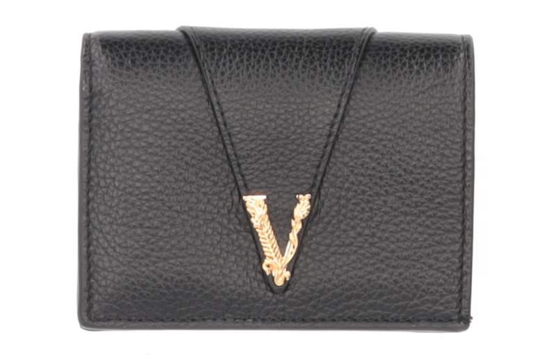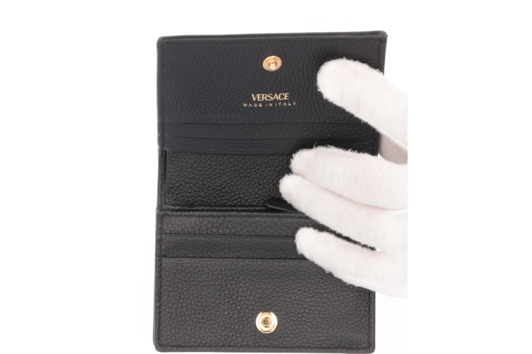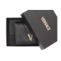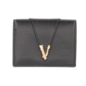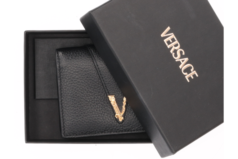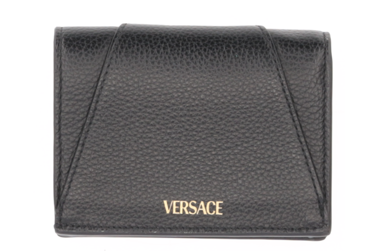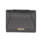 Elegantes Versace Portemonnaie aus hochwertigem, genarbtem Leder in Schwarz. Die ikonische V-Logo-Applikation in goldfarbenen Beschlägen verleiht dem kompakten Design einen edlen, modernen Look. Ideal für Karten, Bargeld und Essentials – stilvoll und alltagstauglich zugleich.